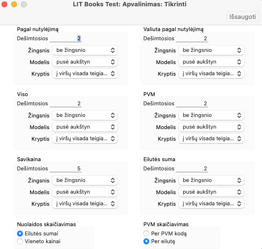 Ši skiltis kontroliuoja PVM skaičiavimo apvalinimą kiekvienoje matricos eilutėje (tačiau skaičiai, rodomi PVM lauke po visomis matricomis, apvalinami naudojant ankstesnę skiltį „Valiuta agal nutylėjimą “). Skaičių po kablelio kiekis negali viršyti aukščiau nurodyto „Pagal nutylėjimą“ kiekio.