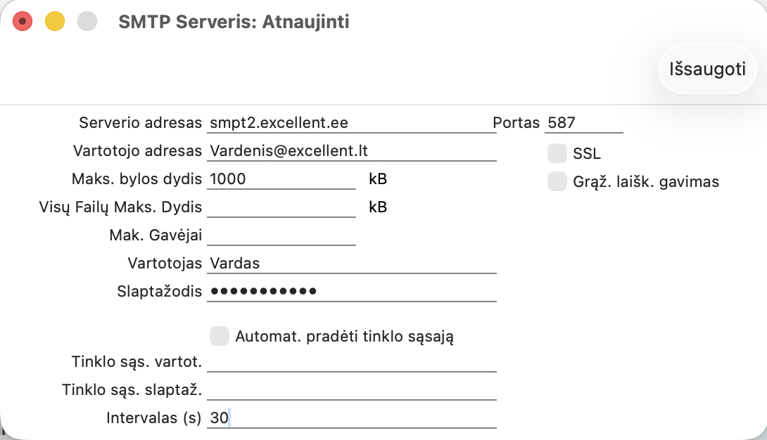 Nurodykite slaptažodį, kurį naudojate prisijungdami prie SMTP paskyros. Šią informaciją galite gauti iš savo paslaugų teikėjo arba rasti standartinės el. pašto programos (pvz., „Outlook“, „Apple Mail“ ir kt.) nustatymuose.