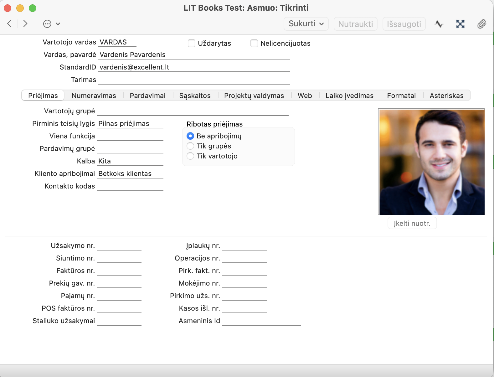 Aukščiau pateiktame pavyzdyje vartotojui nustatytas „Pradinis vartotojo lygis – Pilna prieiga“, kas leidžia atlikti visus būtinus pagrindinius veiksmus, nors neapima kai kurių specialių veiksmų, pavyzdžiui:
