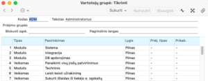 Kiekvienoje konkrečioje grupėje galima suteikti arba atimti įvairias teises darbui programoje. Norint pritaikyti grupės nustatymus, kodą (pvz., ADMIN) reikia įvesti į lauką „Vartotojų grupės“. Asmeniui galima priskirti kelias vartotojų grupes, atskiriant jas kableliu.